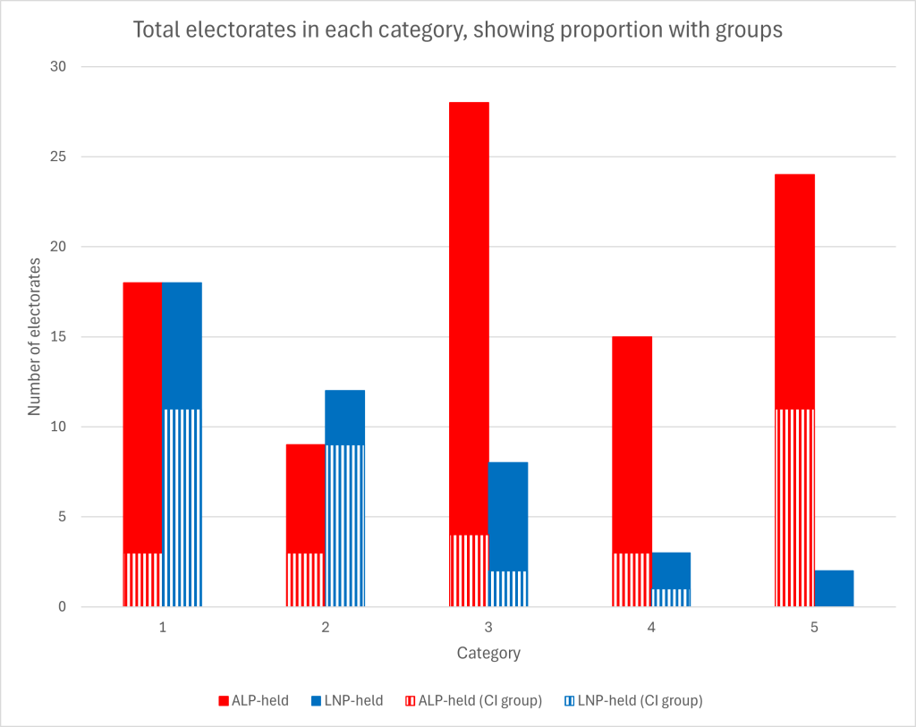 A similar number of ALP and LNP seats fall into categories 1 and 2, while the proportion of ALP seats in the lower categories is much higher. Together, a total of 93 seats in categories 1-3 can be considered vulnerable to independent candidates, amounting to nearly two-thirds of the parliament.